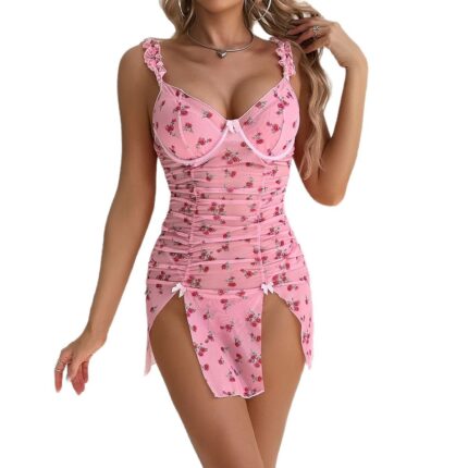 High elasticity mesh contrasting color bandage tight fitting perspective lingerie suspender jumpsuit