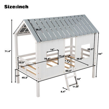 Twin Size House Platform with Roof and Window, White+Antique Grey