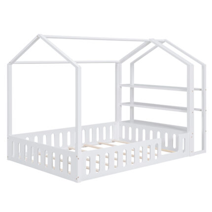 Full Size Wood House Bed with Fence and Detachable Storage Shelves, White