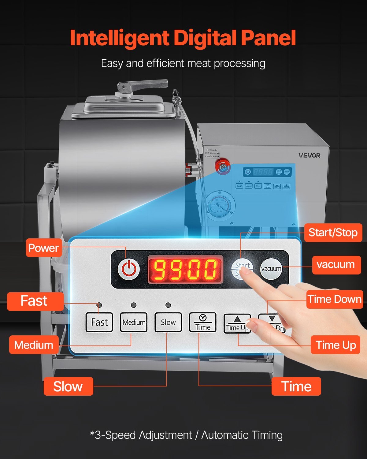 Easy to Use: Features an intelligent panel design, offering three speed settings (high, medium, low), and precise time control, the commercial meat tumbler has multiple functions and easy operation