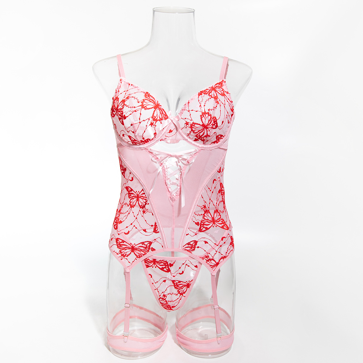 High-Quality Lingerie Set with Butterfly Embroidery Lace Cross-Tied Sexy Three-Piece Set