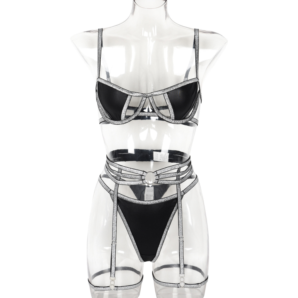 Lingerie Style Sexy Set with Gold and Silver Striped PU Leather Splicing for Women