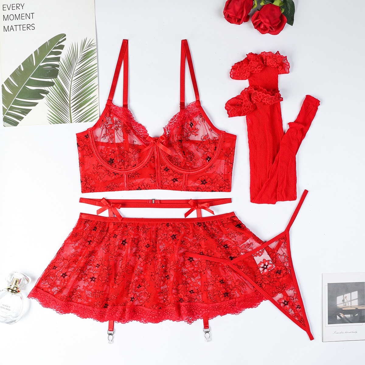 Muse New European and American Style Sexy Lingerie Red Lace Transparent Four-Piece Set Festival Dress for Women