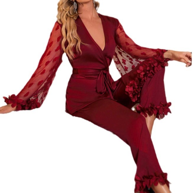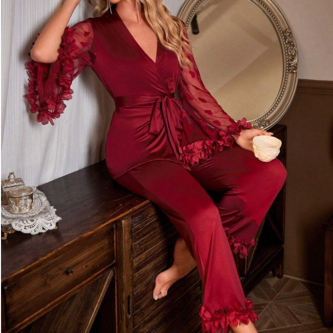 Sexy Satin Lace Heart Trumpet Sleeve Pajama Long Pants Set