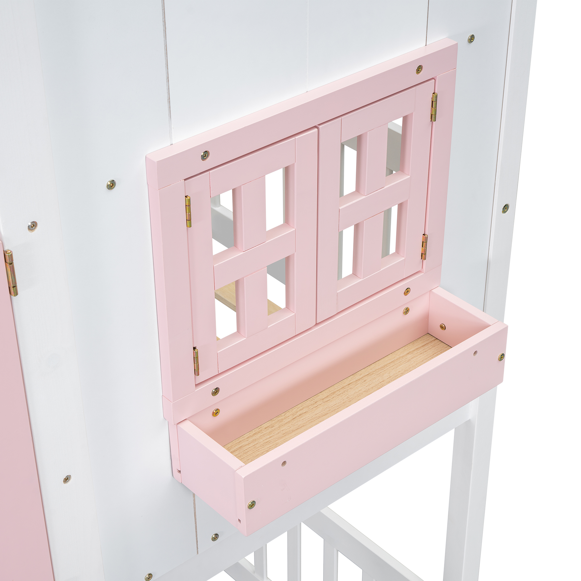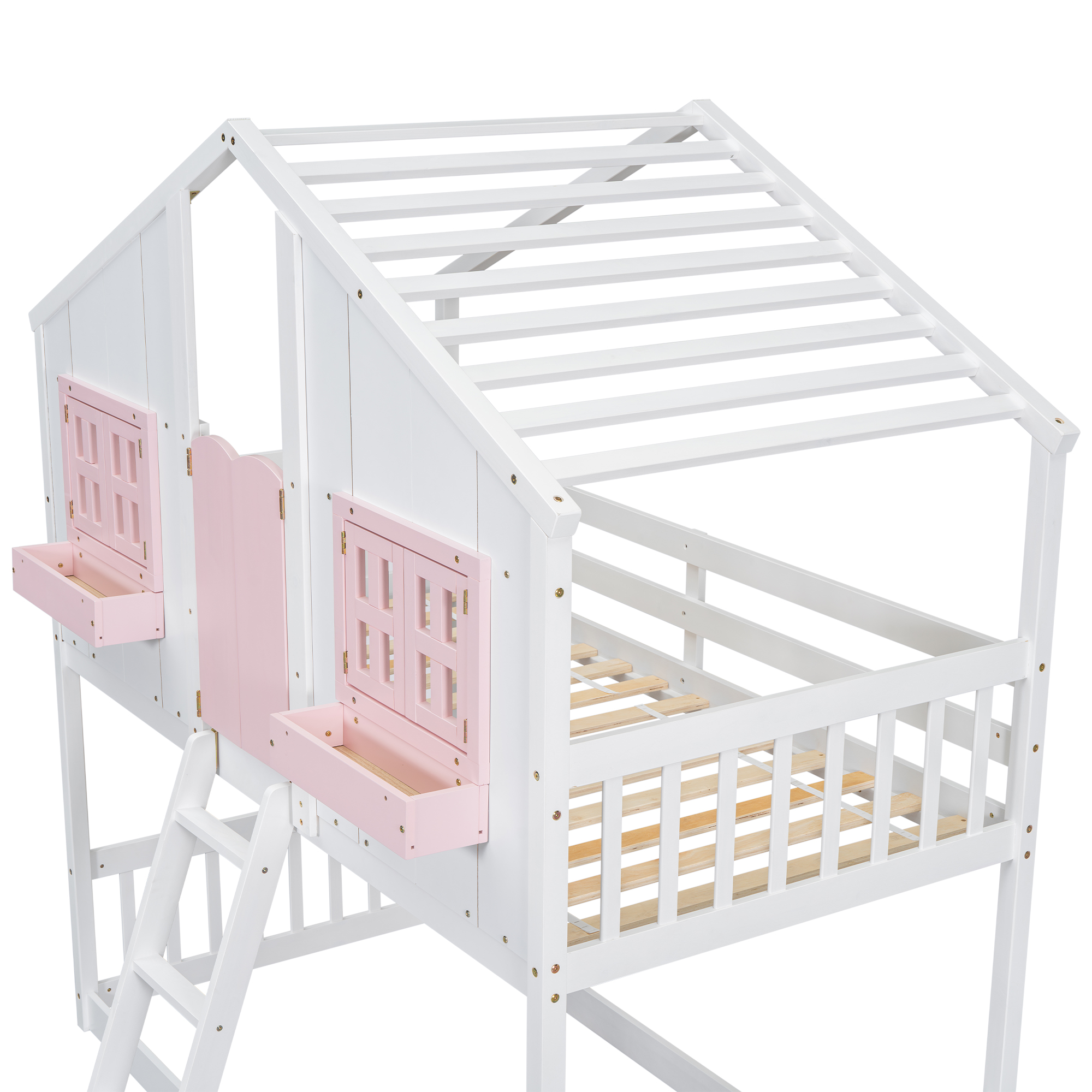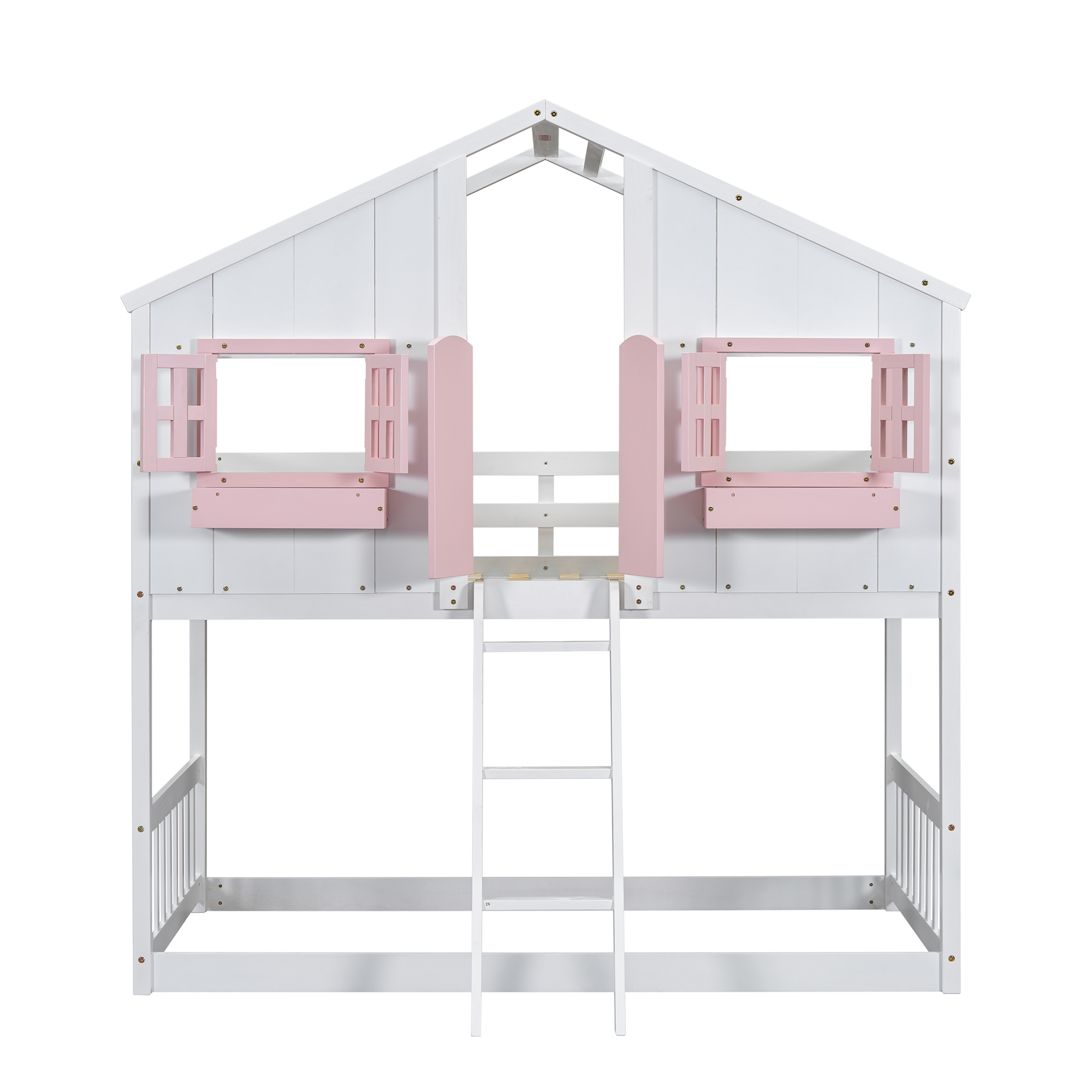 Twin over Twin House Bunk Bed with Roof , Window, Window Box, Door , with Safety Guardrails and Ladder, Pink/White